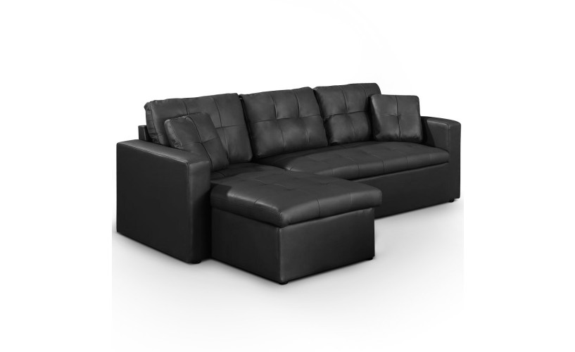 Le canapé d’angle convertible Toledo noir est un modèle d’élégance et de confort avec son revêtement en simili cuir et son dossier capitonné. Il est possible de changer l’angle du canapé en déplaçant la méridienne du côté droit ou gauche de l’assise principale. Il s’adapte ainsi à toutes les configurations !