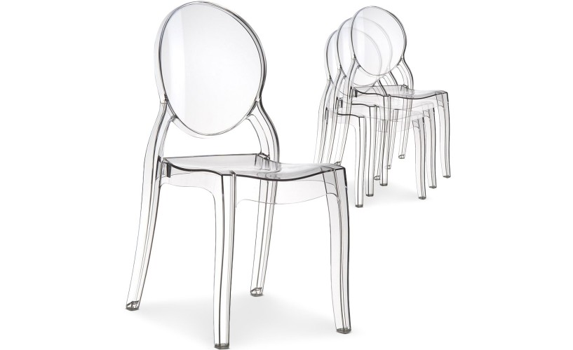 Le lot de quatre chaises médaillon Diva en PVC transparent convient aussi bien à votre intérieur qu’à votre terrasse. Modernes et confortables, les chaises Diva sont stables et résistantes. En PVC transparent, elles se marient avec toutes les matières et toutes les couleurs.