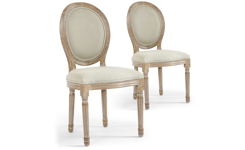 Le lot de deux chaises de style médaillon Louis XVI en tissu beige est idéal pour un intérieur classique et raffiné, mais convient également à un intérieur plus moderne. De qualité supérieure avec leur structure et leurs pieds en bois légèrement cérusés, les chaises de style médaillon Louis XVI sont très confortables et revêtues d’un tissu résistant.